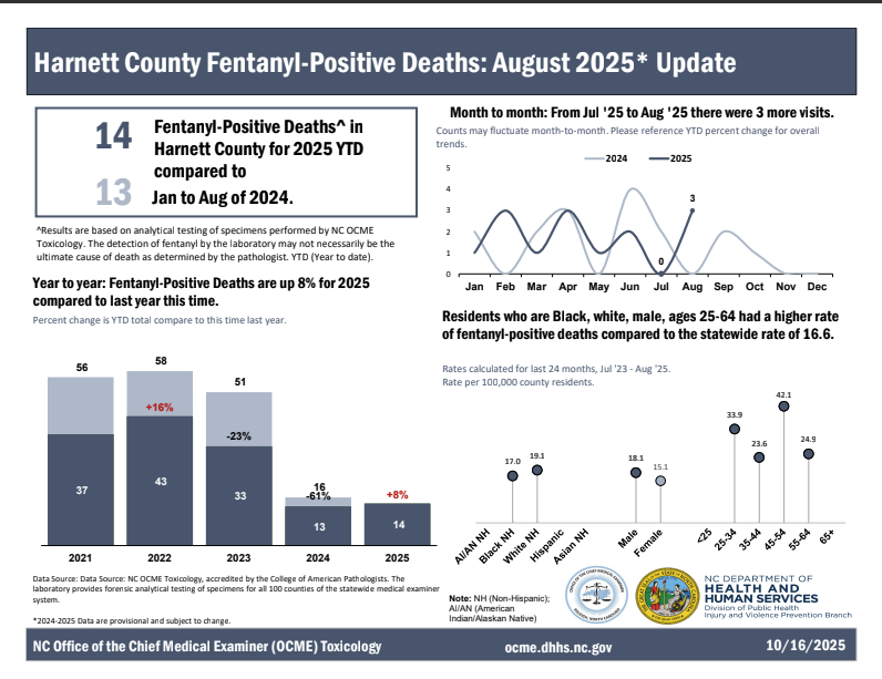 Harnett County’s overdose death rate has increased more than tenfold since 2000. Per 100,000 people, the overdose death rate rose from 4.4 in 2000 to 52.2 in 2021.
